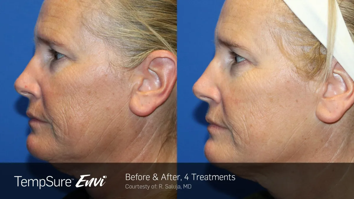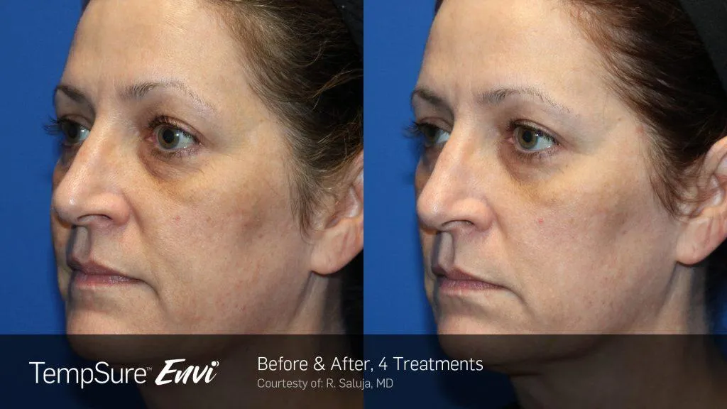 TempSure Envi can treat the eye area, face, neck, chest, upper arms, knees or anywhere on the body with loose or thinning skin. It’s typically performed as a series of treatments scheduled 2–4 weeks apart.